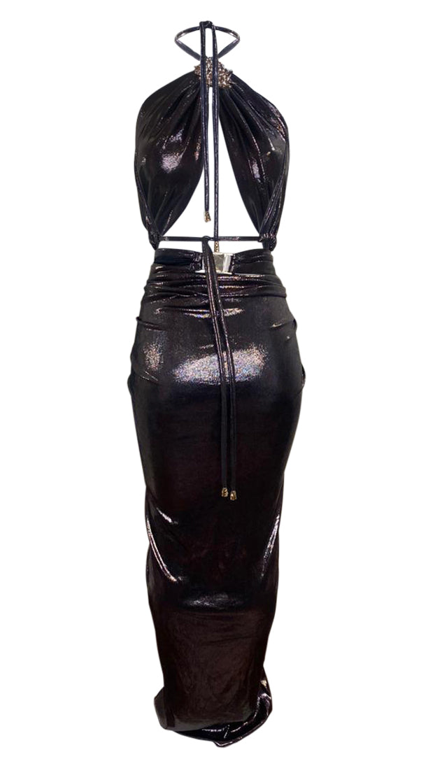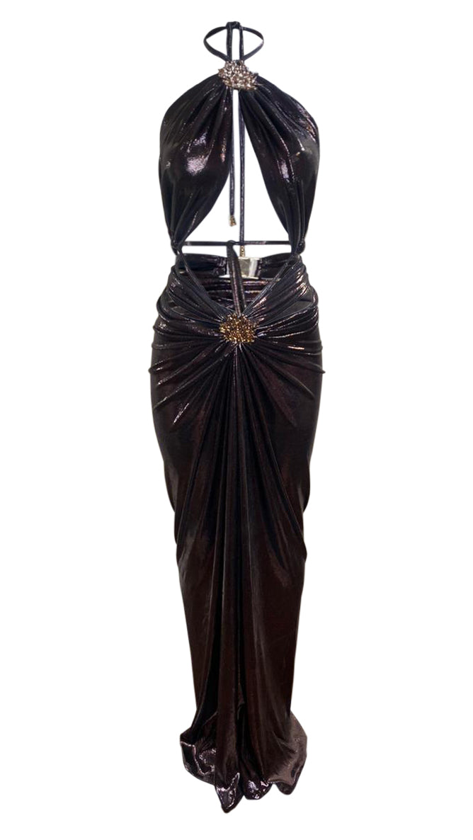 Nymera emotes the sensuality of movement of ocean life. Featuring intricate J.Angelique Gold Coral motifs, this dress showcases a bold neckline complemented by a gracefully draped skirt with a front slit and stylish straps.