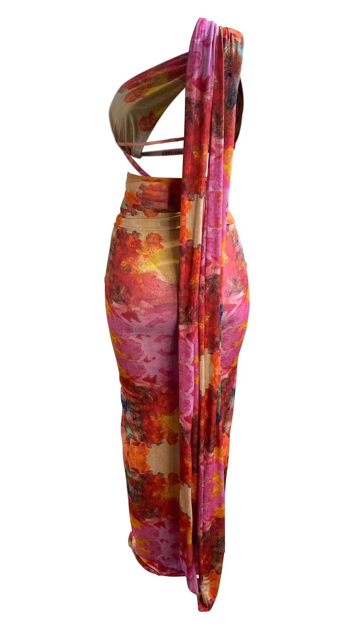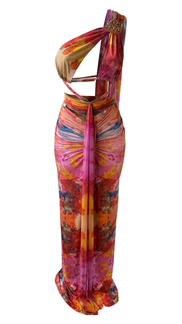 Sephira awakens the spirit of the sea, where movement meets magic and myth becomes style. This gown features an asymmetrical bodice with a flowing cape adorned with Signature Golden Coral.